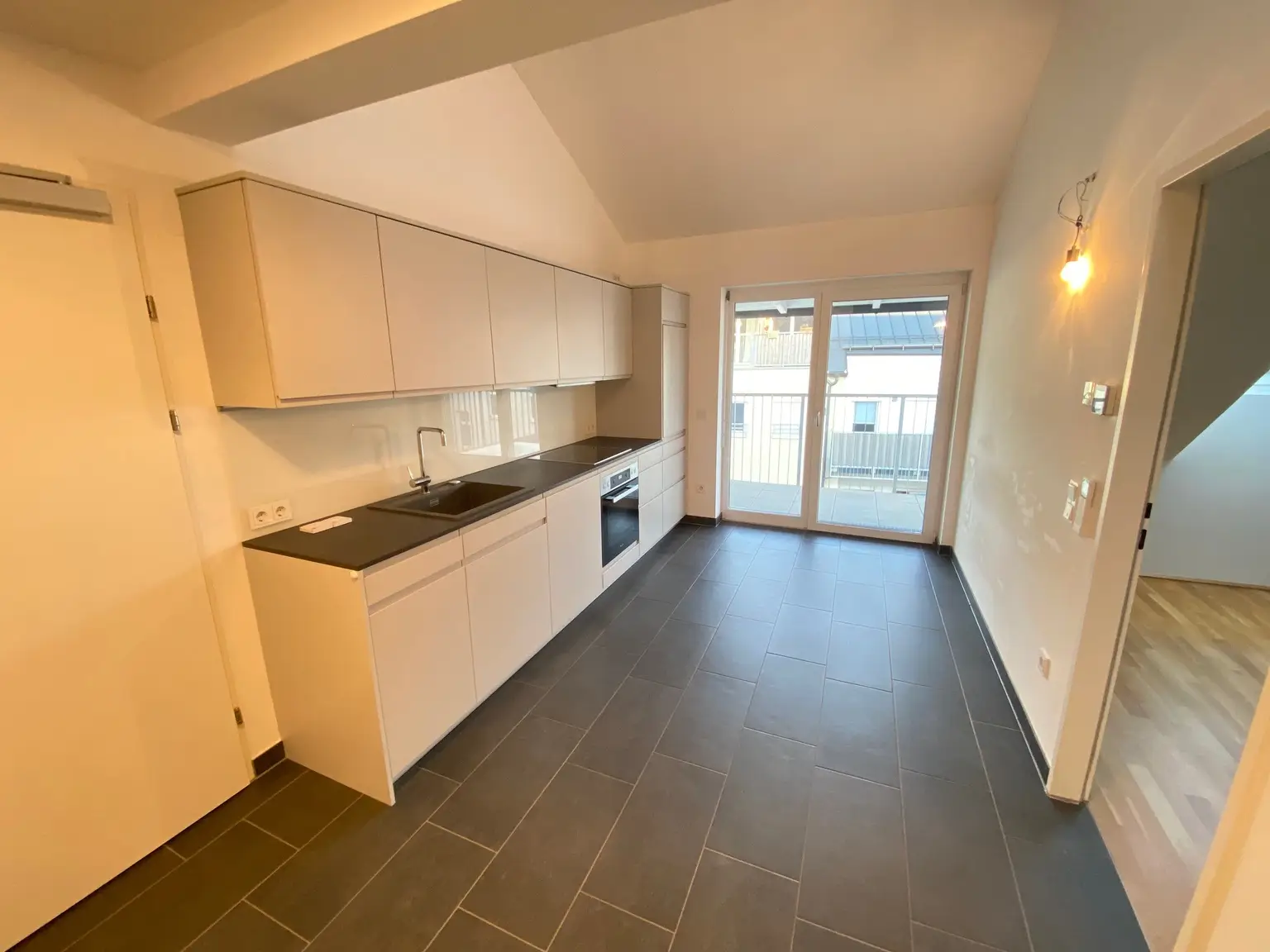 Auf der ersten Ebene im Vorraum angekommen, gelangen Sie in die Essküche mit hofseitigem Balkon. Auf der selben Ebene befindet sich ein kompakter intimer Bereich mit Schlaf- und Badezimmer sowie ein extra WC. Über die interne Treppe im Vorraum gelangen Sie auf die sonnige Empore, welche sich ideal als Wohnzimmer einrichten lässt. Auf Anfrage übersenden wir Ihnen selbstverständlich den Grundrissplan der Wohnung.