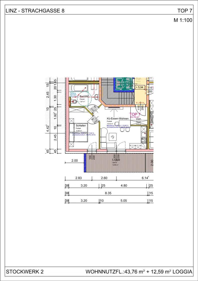 Die Gesamtnutzfläche beträgt 56,35 m² (43,76 m² Wohnung + 12,59 m² Loggia)
